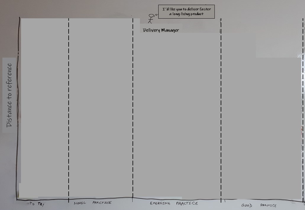 - On the horizontal axis, we shall represent the degree of control we have for each element displayed. For this, we’ll use the following categories: « to try », « new practice », « emerging practice », « good practice », « integral part of the culture of the team ».