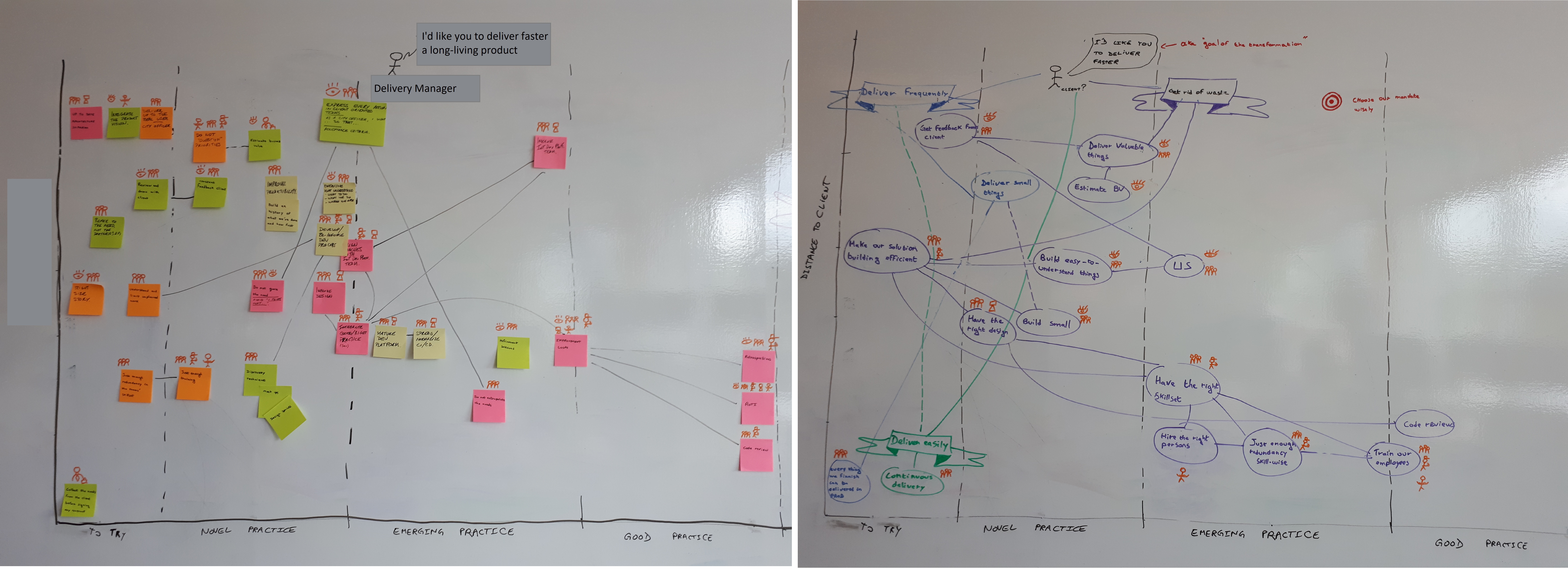 Who’s got the best opinion? Impossible to say. Until then, the expert status I was tacitly granted when I was hired, prevented me from falling for this kind of mistake. But no longer was it enough this time. Like any coach in search of alignment, I immediately thought about resorting to Visual Management. And yet, posting a « roadmap » wouldn’t have got me out of trouble. Even co-constructing it would have just made us focus the whole discussion on the best opinion within a quite inefficient workshop. I needed something else, and that’s why I decided to build a battle map of transformation. This one will allow placing the forces involved along with their states and help to decide which movement is the most relevant to achieve our goal.